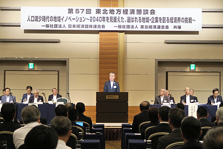 経団連(筒井義信会長)と東北経済連合会(東経連、増子次郎会長)は9月18日、仙台市内で「第57回東北地方経済懇談会」を開催した。経団連からは筒井会長、冨田哲郎審議員会議長、副会長らが、東経連からは増子会長をはじめ会員約170人が参加し、「人口減少時代の地域イノベーション~2040年を見据えた、選ばれる地域・企業を創る経済界の挑戦」を基本テーマに意見交換した。