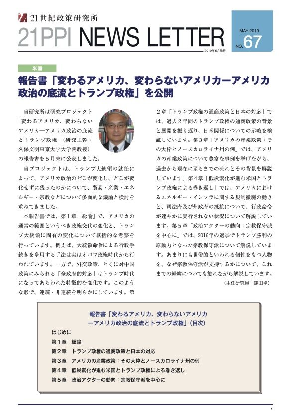 No.67 報告書 「変わるアメリカ、変わらないアメリカーアメリカ 政治の底流とトランプ政権」 を公開