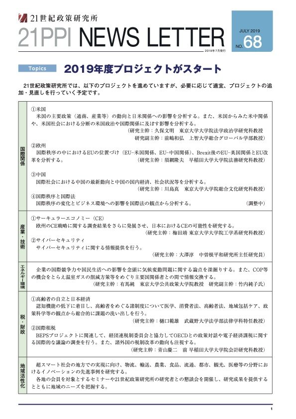 経団連総合政策研究所で行っている各種の活動の概要をとりまとめ、ニュースレターとして発刊しています。報告書の内容、シンポジウムやセミナーの模様などを端的に理解するものとしてご利用いただけます。