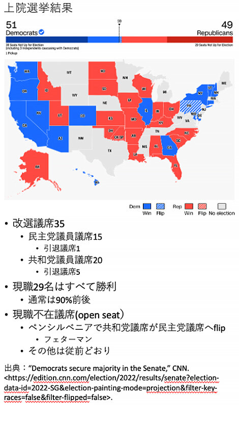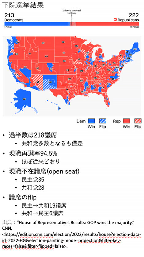 「トランプか否か」を問う演出が前面に出たこと、妊娠中絶の権利を問うドブス判決で49年にわたる伝統的な判例が変更されたこと、この二つの事情により、事前に予測されていた「レッドウエーブ」は起きなかった。共和党は中間選挙を大統領への擬似的な信任投票とする機会を逸し、大勝ちすることはできなかったものの、 さまざまな選挙区で共和党が票を伸ばしていることに注意すべきで、2024年の大統領選挙にも関係してくるかもしれない。今回の中間選挙に関しては分断の行方が一つの関心であったが、その状況は続いていくことになろう。
