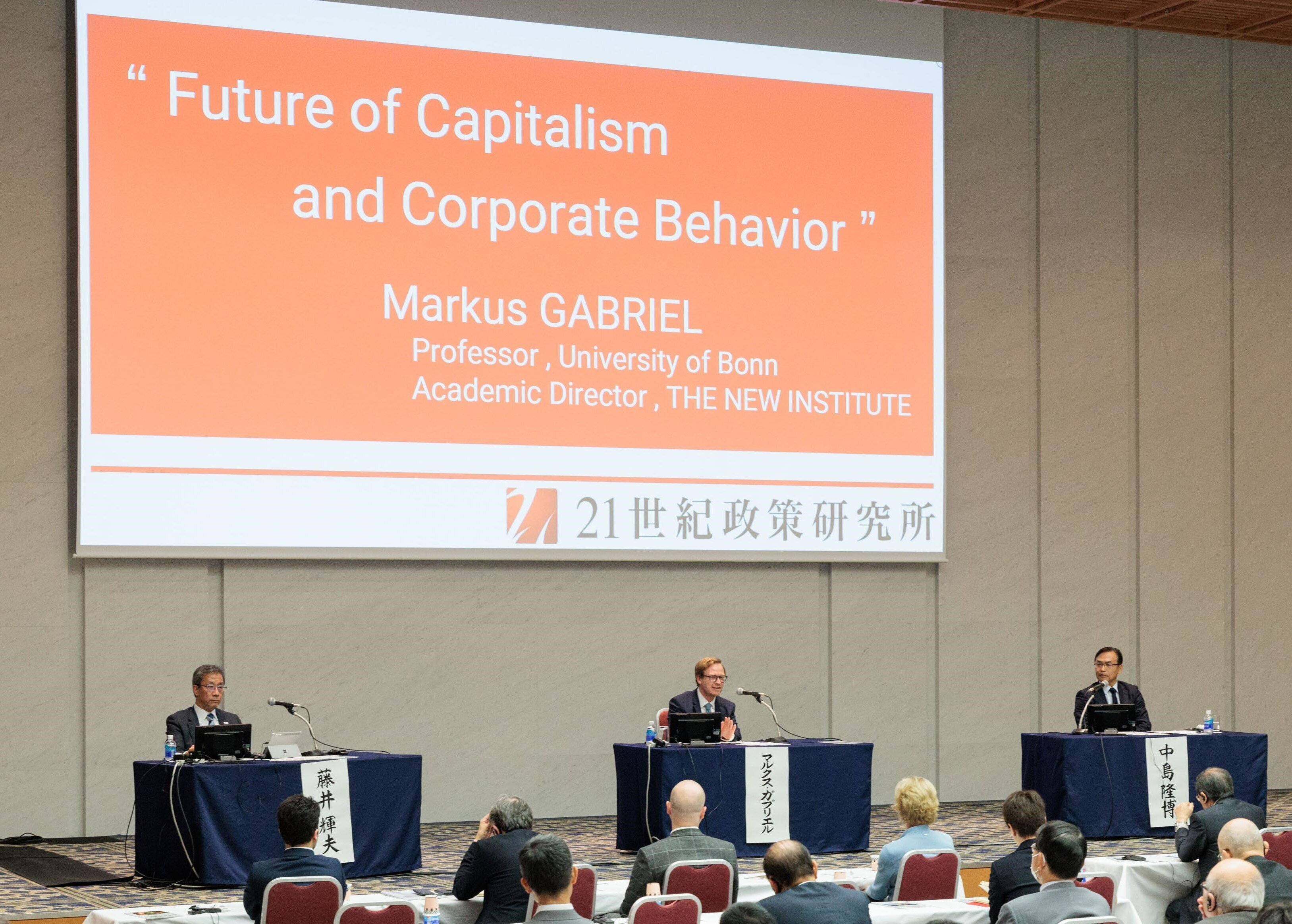 21世紀政策研究所では、5月8日、東京・大手町の経団連会館でドイツのハンブルクにあるThe New Institute(TNI)のアカデミックディレクターも務める、ボン大学のマルクス・ガブリエル教授を迎え、十倉会長との対談および経済広報センターとの共催によるシンポジウムを開催しました。
