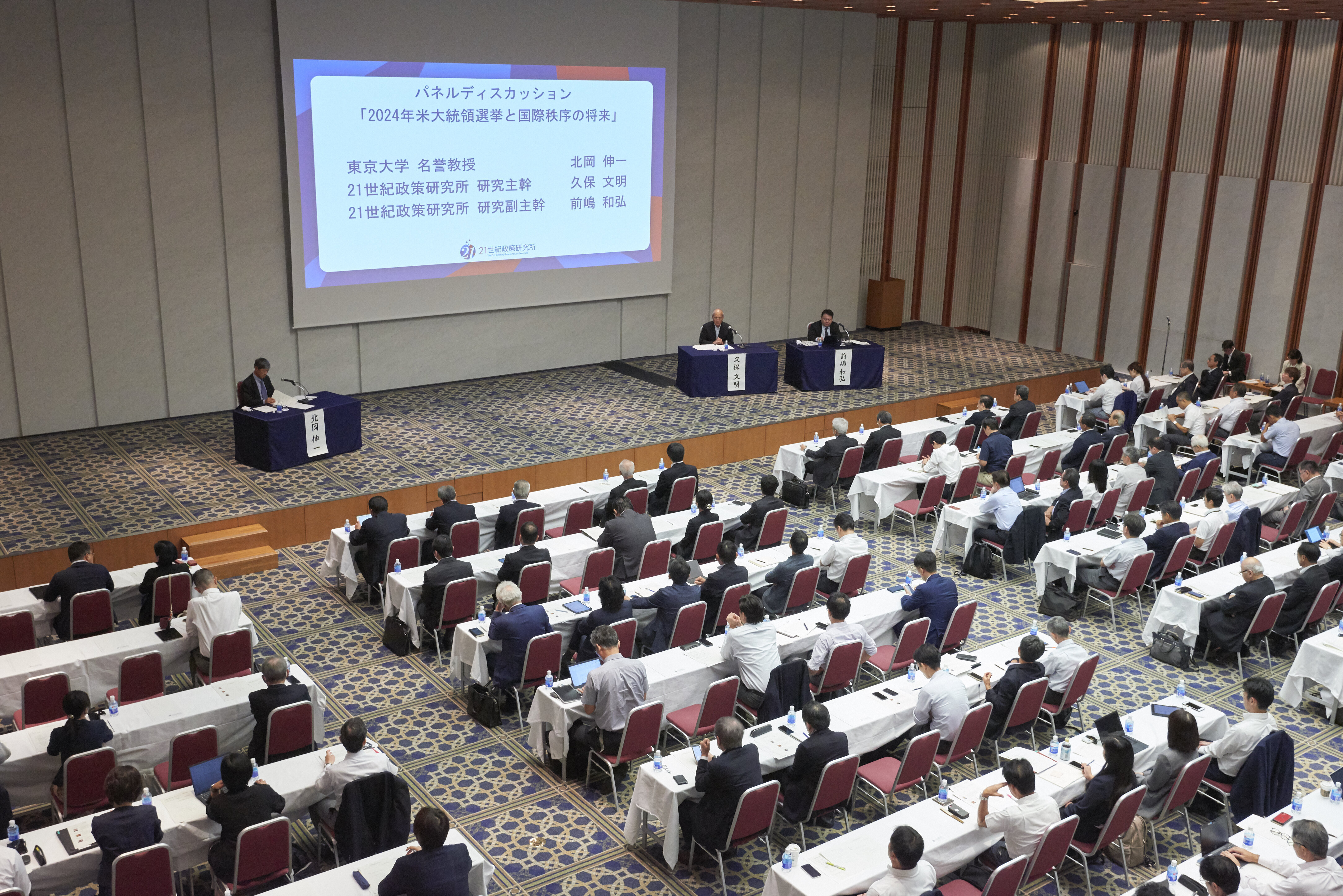 21世紀政策研究所の米国研究プロジェクト(研究主幹=久保文明防衛大学校長)は9月18日、東京・大手町の経団連会館でシンポジウム「2024年米大統領選挙と国際秩序の将来」を開催しました。前半は東京大学の北岡伸一名誉教授が講演。後半は久保研究主幹がモデレーターとなって、北岡氏と前嶋和弘研究副主幹(上智大学総合グローバル学部教授)の3人でパネルディスカッションを行いました。概要は次のとおりです。