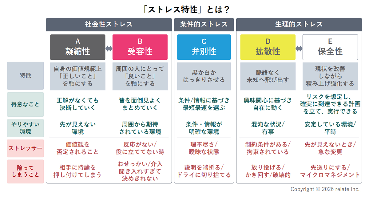 ストレス特性とは、外部からの刺激にどう反応し、何を優先して行動するかといった傾向を示すものであり、個人の思考やコミュニケーションのクセを理解する手がかりとなる(図表参照)。