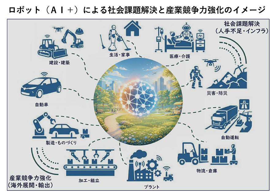 人口減少および少子高齢化に伴う構造的な人手不足や、老朽化インフラの維持管理等の社会課題に直面するなか、AIを搭載したロボット(AI+)には社会課題解決と産業競争力強化の双方に資する潜在力がある。