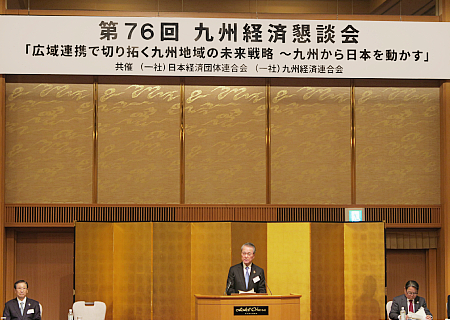 経団連(筒井義信会長)と九州経済連合会(九経連、池辺和弘会長)は3月12日、福岡市内で「第76回九州経済懇談会」を開催した。経団連からは筒井会長、副会長らが、九経連からは池辺会長をはじめ約200人が参加し、「広域連携で切り拓く九州地域の未来戦略~九州から日本を動かす」を基本テーマに意見交換した。