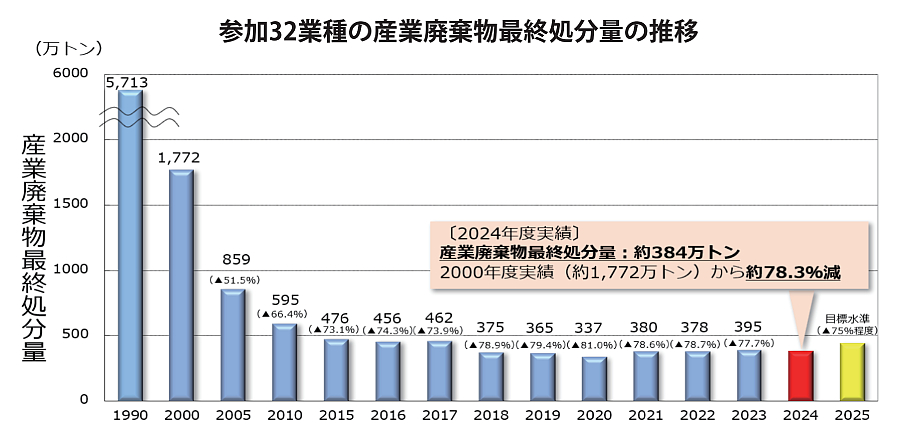 24年度の産業廃棄物最終処分量の実績は約384万トンで、基準年である00年度(約1772万トン)から約78.3%減少となり、第5次目標(25年度に00年度実績比75%程度削減)を達成した(図表参照)。