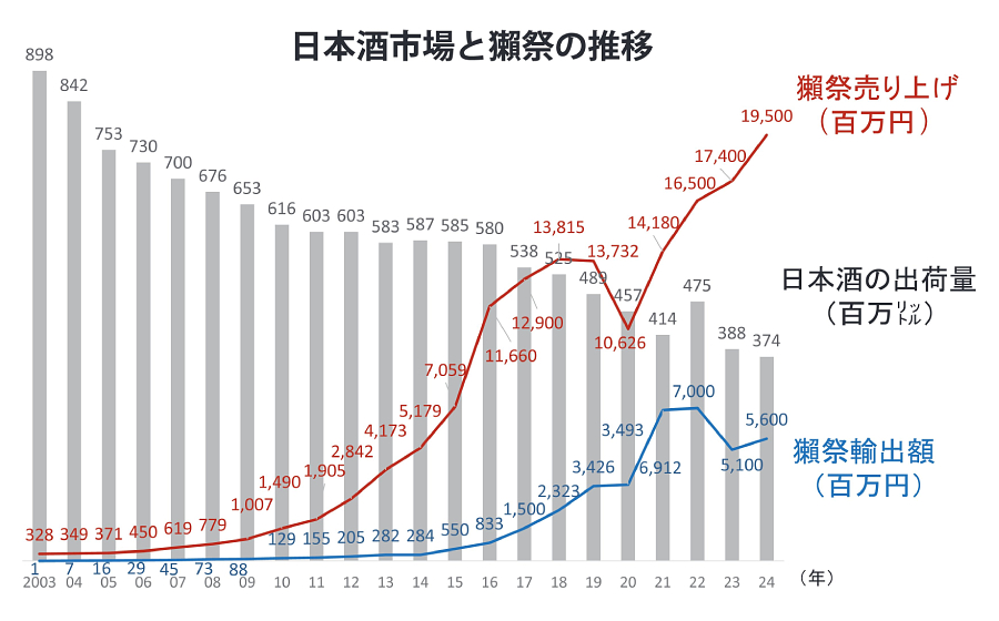 獺祭は山口県岩国市周東町の人口20人ほどの集落に位置する酒蔵であり、前身の酒蔵を含めると、約200年にわたり酒造りを続けてきた。現在は売り上げ200億円規模へと成長し、日本酒の輸出でも大きな存在感を示している(図表参照)。